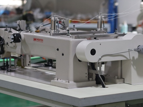 Heavy Duty 4 Needle Compound Walking Foot & Puller Feed Lockstitch Sewing Station, custom made for PET Geotextile Tubes, silt curtains and baffles & pollution booms, tents, parachutes, sails, tarps, awnings, field covers,military & tactical Gear, shade structures and heavy bulky products.