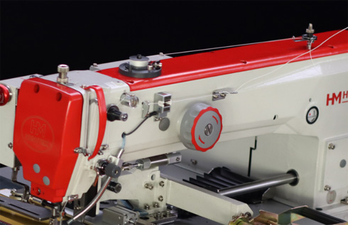 4. The hand pulley is installed on this side of the machine head. This allows the operator to visually check the needle entry and adjust hook timing with ease.