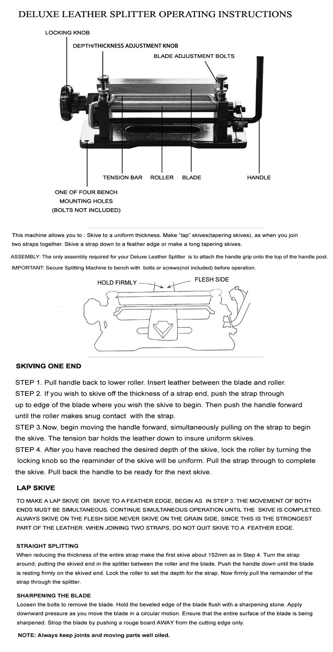 This Leather splitter is ideal for hobby or light manufacture. Used to thin (skiving) leathers down to a uniformed thickness. Fully adjustable to split most thicknesses of leather. Note - these are made mainly for vegetable tanned leather.