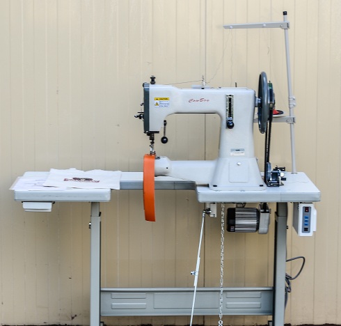 Máquina para coser materiales pesados con hilo grueso. Máquina de triple arrastre y lanzadera barrel para guarnicionería, talabartería, sofás y sillones, tapicería para muebles y automíviles, eslingas de elevación, trincaje de cargas, cintas para amarre y sujeción, arneses de seguridad, marroquinería.